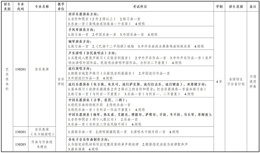3.我校2025年音樂表演專業(yè)只招收以下所列種類,凡未列出的種類該年不接受報(bào)考,考生應(yīng)使用校考報(bào)名時(shí)所選的唱法或樂器種類進(jìn)行演奏。具體如下:
