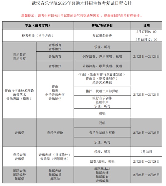 武漢音樂學院2025年普通本科招生校考復試日程安排