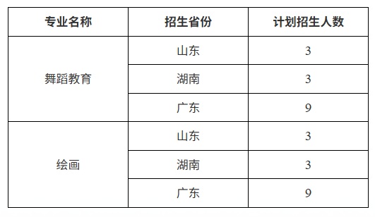 藝術(shù)類專業(yè)面向廣東、山東、湖南共3個省份招生,在生源省份規(guī)定的錄取批次,按照招生省份藝術(shù)類專業(yè)招生錄取辦法擇優(yōu)錄取。學校藝術(shù)類招生專業(yè)使用省級統(tǒng)考成績作為專業(yè)考試成績,考生須參加相應類別(子科類)的統(tǒng)考(省統(tǒng)考各科類考試科目及考試要求詳見各省市普通高等學校藝術(shù)類專業(yè)省統(tǒng)考考試說明)。