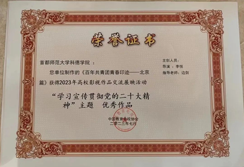 由李悅同學(xué)創(chuàng)作,邊劍老師指導(dǎo)的《百年共青團(tuán)青春印記--北京篇》獲得專題片類二類作品獎項、學(xué)習(xí)宣傳貫徹黨的二十大精神主題視頻專題片類二類獎項。