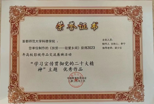 由李寧同學(xué)創(chuàng)作,梁少云老師指導(dǎo)的《扶貧-駐愛鄉(xiāng)間》獲得專題片類二類作品獎項、學(xué)習(xí)宣傳貫徹黨的二十大精神主題視頻專題片類。