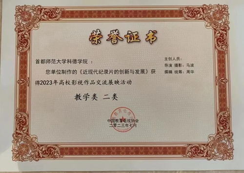 由周華老師聯(lián)合馬波導(dǎo)演共同創(chuàng)作的《近現(xiàn)代紀(jì)錄片的創(chuàng)新與發(fā)展》獲得教師組教學(xué)類二類作品獎項。