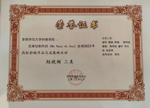 由胥明俊、董軒、李光祖、連世錚等同學(xué)一起創(chuàng)作,周華老師指導(dǎo)的《WeRaceAsOne》獲得短視頻類三類作品獎項。