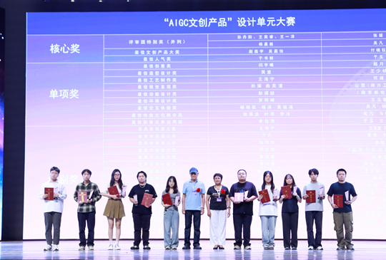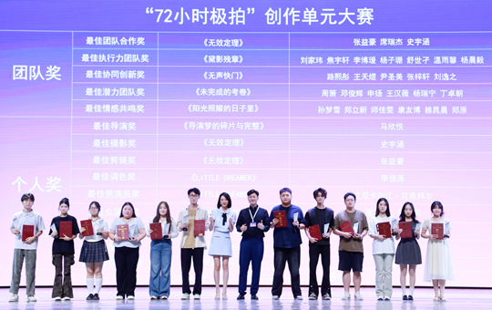 頒獎環節,首先頒發的是單元獎,程源海先生、寧遠景先生為“經典電影仿拍”競賽單元獲獎代表頒獎。姬永兵先生、宋欣慧女士為“AIGC文創產品設計”競賽單元獲獎代表頒獎。阮圣文先生、王文綺女士為“72小時極拍”競賽單元獲獎代表頒獎。