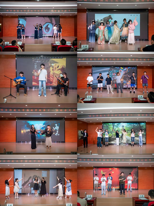 在決賽現場,各宿舍團隊通過音樂、舞蹈、朗誦等多種形式,向觀眾傳遞了青春的活力與宿舍情誼。其中,青藤社區的N10-442宿舍以吉他彈唱《情非得已》贏得了評委和觀眾的熱烈掌聲;知嶼社區的N9B-321宿舍則通過舞蹈情景劇《小玉壺》展現了宿舍的溫暖與生活熱愛;向陽社區的N2B-355宿舍以合唱《Good Time》展現了團結向上的精神風貌。