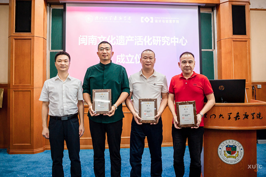 嘉庚學院院長助理葉志筑,國家級技能大師郭勁旺,福建省省級工藝美術(shù)大師徐建勇和設(shè)計與創(chuàng)意學院院長林波教授一同為研究中心揭牌。儀式由設(shè)計與創(chuàng)意學院周濤副教授主持。