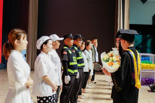 在典禮特別設置的致謝后勤人員環節,畢業生代表為食堂、宿管、保潔等一線工作人員獻花致謝,感謝他們在平凡崗位上的堅守與奉獻。后勤處餐飲中心為畢業生準備了精美紀念品,后勤處分管院領導楊濤暖心叮囑:“身體健康很重要,一定要記得好好吃飯,保護好革命的本錢,未來才會走得更遠!”