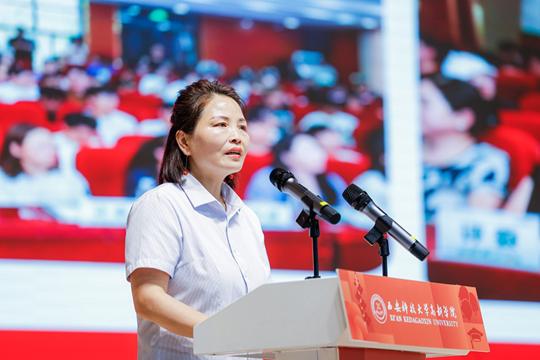 公寓管理中心宿管員李亞茹老師作為畢業生“最熟悉的守護者”登臺發言,她用溫暖質樸的話語為同學們送上臨行前的叮嚀:“親愛的孩子們,你們是雛鷹要飛向更廣闊的天空,阿姨為你們高興,也為你們驕傲,請帶著你們的夢想,你們的熱情,還有阿姨的祝福,勇敢的去闖吧,阿姨祝你們前程似錦,鵬程萬里!