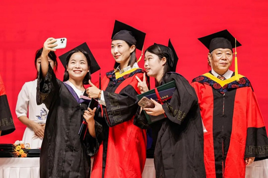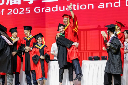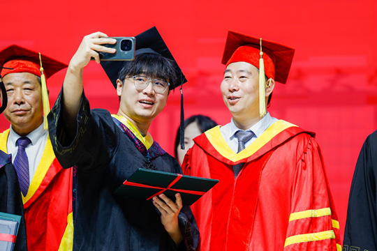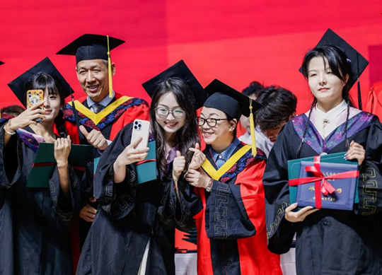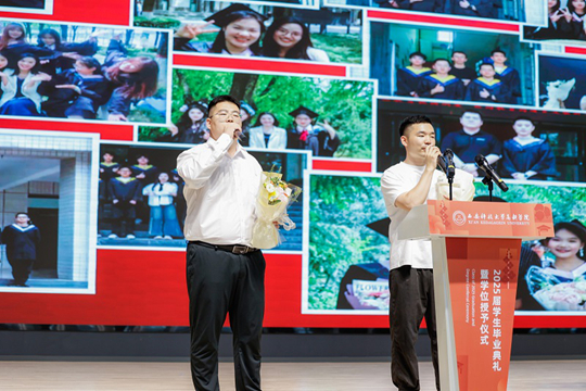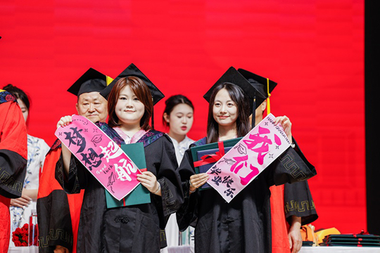 隨后,2025屆畢業典禮暨學位授予儀式正式啟幕,這場屬于畢業生的盛會,悄然變身充滿溫情與歡樂的“大型寵粉現場”,定格下無數動人的青春瞬間。儀式現場,同學們用創意與熱情書寫著畢業的獨特記憶:有的拉著師長并肩比耶,指尖揚起的弧度里藏著四年師生情;有的與老師隔空比心,鏡頭將這份雙向奔赴的溫暖永久留存;揮舞的環保彩帶在空中劃出絢麗弧線,映照著一張張歡呼雀躍的笑臉;更有同學帶著滿滿的心意,為院長送上極具地域特色的“三秦”套餐,這份接地氣的祝福讓現場笑聲不斷,甚至有熱情的學生給了院長一個猝不及防的熊抱,瞬間拉近了師生間的距離。畢業生們手捧承載著校園記憶的畢業紀念品依次上臺合影,每一件禮物都鐫刻著母校的叮嚀;而平日里嚴謹的老師們,此刻也卸下嚴肅,化身溫柔的“寵娃狂魔”,或主動配合拍照姿勢,或溫柔叮囑未來事宜,用行動訴說著“你們永遠是母校的寶貝”。