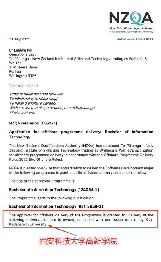 新西蘭學歷認證局(NZQA)正式確認,西安科技大學高新學院與新西蘭惠靈頓理工學院合作舉辦的計算機科學與技術專業持續獲得海外教學資質認證!