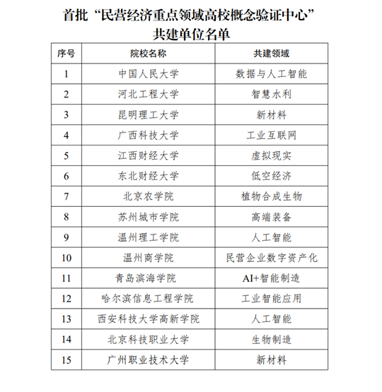 “民營經濟重點領域高校概念驗證中心”共建計劃,是全國工商聯人才交流服務中心與中國民營科技促進會為貫徹落實《中共中央 國務院關于促進民營經濟發展壯大的意見》而開展的重要項目,旨在通過整合高校、民營企業、商(學、協)會等多方資源,加速科技成果產業化進程,解決科技成果轉化“最后一公里”難題。該計劃重點聚焦人工智能、低空經濟、生物醫藥、新能源汽車、新一代信息技術、集成電路、光電子信息、智能制造、新材料、雙碳、數字經濟、工業機器人、工業互聯網、虛擬現實、數字住建、智慧交通等多個前沿領域,力爭在3年內共建150家左右特色鮮明的高校概念驗證中心。