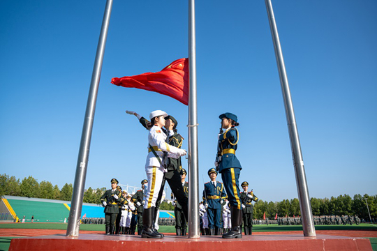 在雄壯的國歌聲中,軍訓(xùn)動員大會拉開序幕。伴隨著五星紅旗的冉冉升起,全體師生肅立,奏唱《中華人民共和國國歌》,表達(dá)對祖國的無限熱愛和崇高敬意。