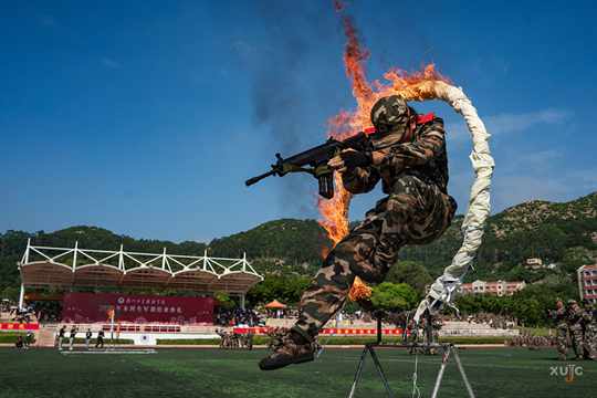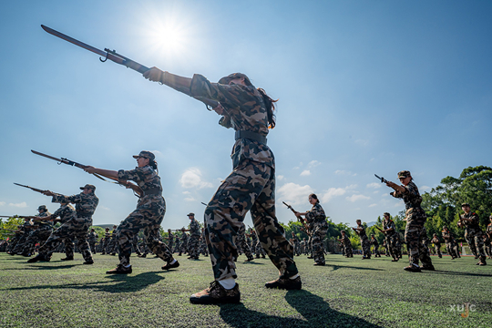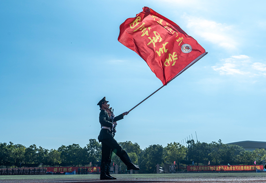 在莊嚴(yán)的國歌聲中,典禮拉開了帷幕。張永輝組織各營進(jìn)行軍訓(xùn)科目匯報表演。