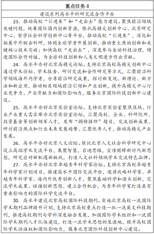 堅持全球視野謀劃高校科技創新,統籌做好“引進來”和“走出去”兩篇大文章,支持高校以科技創新為紐帶,有效利用世界一流教育資源和創新要素,擴大與世界一流大學、科研機構和創新企業交流合作。鼓勵高校加強與“一帶一路”沿線國家創新主體合作,打造北京高校科技創新踐行“一帶一路”倡議合作范式,增強國際影響力。充分發揮懷柔科學城國家重大科技基礎設施優勢,圍繞基礎研究領域,集聚國際一流創新資源,加大國際科技合作交流力度,積極融入全球科技創新網絡。廣泛開展具有國際重大影響的學術活動,高水平辦好北京高精尖論壇、北京實驗室論壇、北京人文論壇、北京卓越青年科學家論壇等科技交流活動,支持高校舉辦一流國際學術期刊和高端國際科學會議,打造世界級學術交流中心。