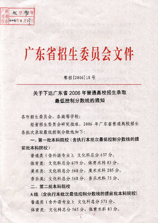 關于下達廣東省2006年普通高校招生錄取最低控制分數線的通知