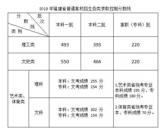 2019年福建省普通高校招生各類錄取控制分數(shù)線公布