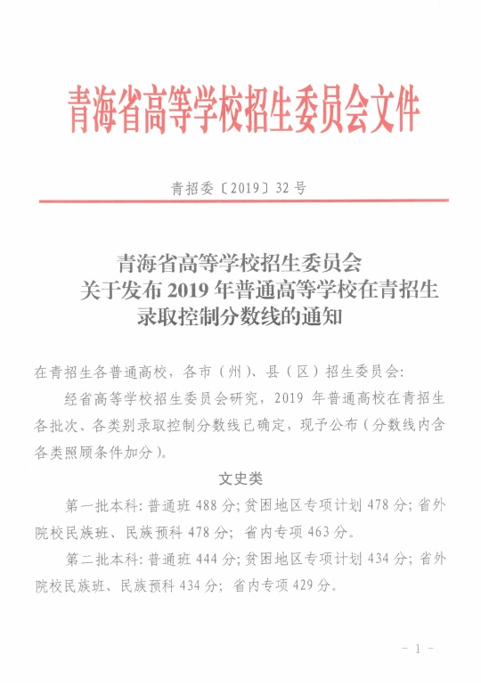 青海:關(guān)于發(fā)布2019年普通高等學(xué)校在青招生錄取控制分?jǐn)?shù)線的通知 |