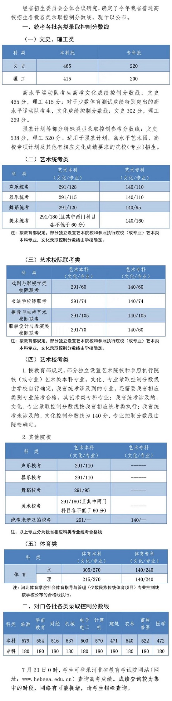 2020年河北省普通高校招生各批各類錄取控制分數線