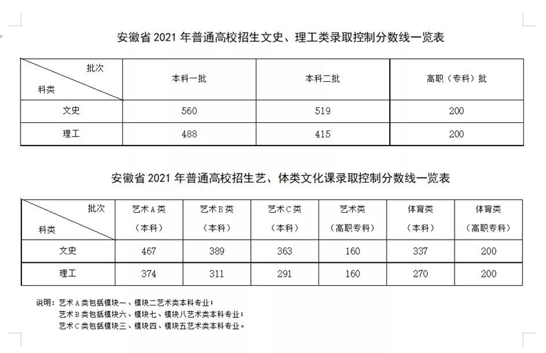 關(guān)于公布安徽省2021年普通高校招生錄取控制分?jǐn)?shù)線的公告