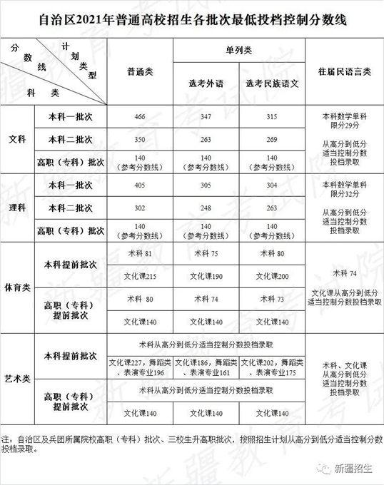 新疆2021年普通高校招生各批次最低投檔控制分?jǐn)?shù)線確定 |