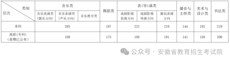 安徽省2024年普通高校招生藝術類統考批次專業課錄取控制分數線