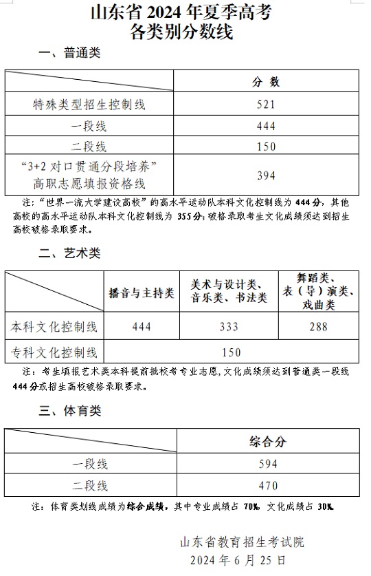 山東省2024年夏季高考各類別分數(shù)線