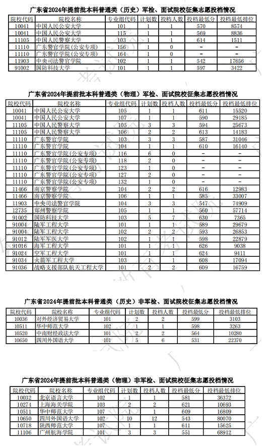 廣東省2024年提前批本科征集志愿投檔情況 |
