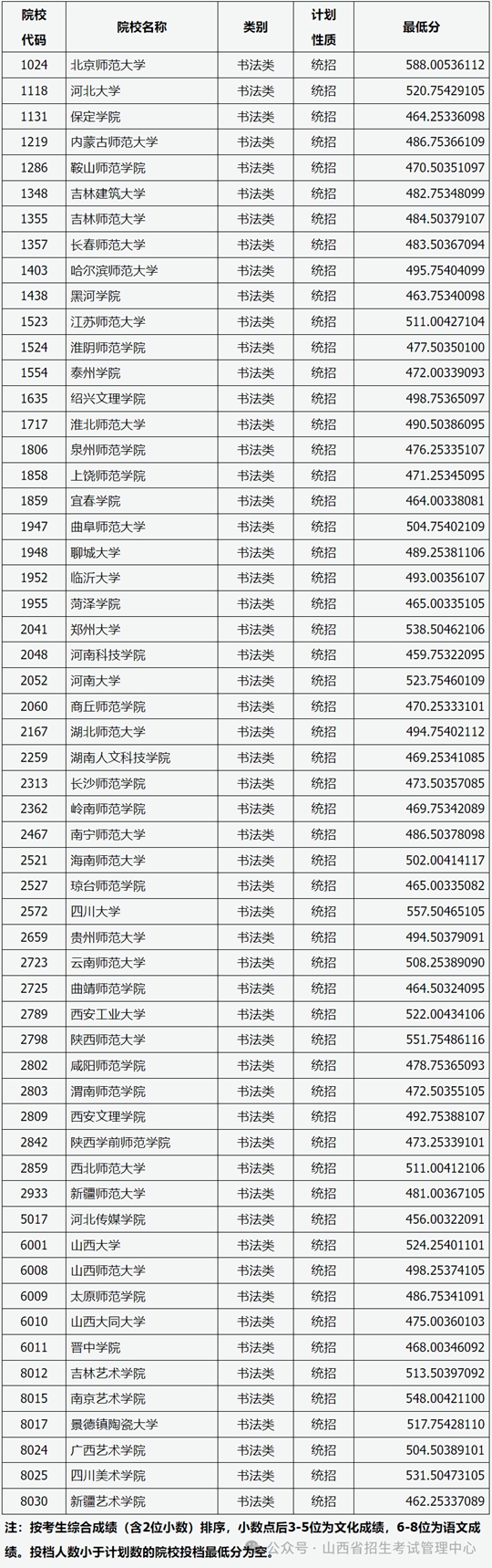山西省2024年普通高校藝術本科批(書法類)院校投檔最低分