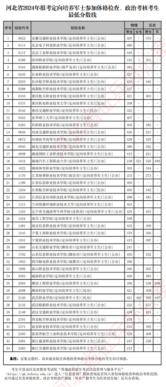 河北省2024年報考定向培養軍士參加體格檢查、政治考核考生最低分數線