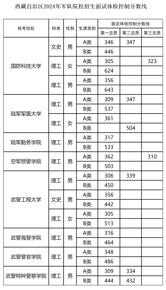 2024年軍隊院校在藏招收普通高中畢業生面試體檢控制分數線 |
