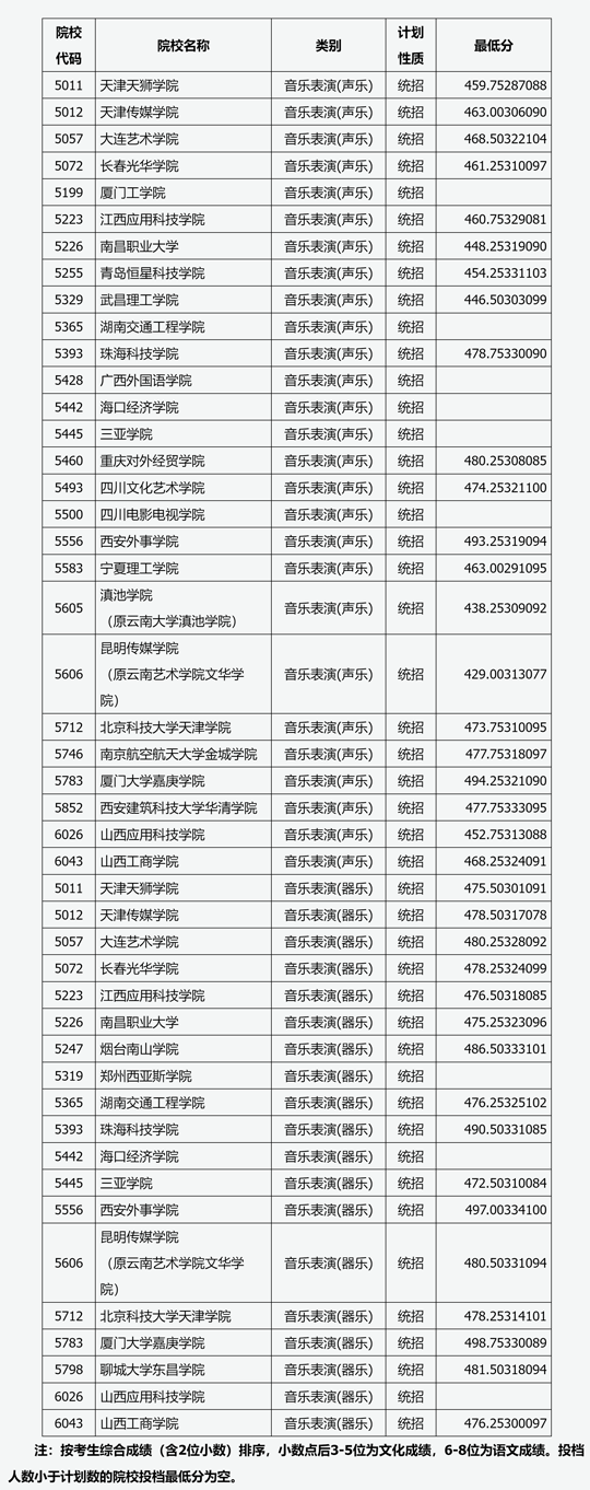 山西省2024年普通高校招生第二批本科C類(音樂表演類)院校投檔最低分