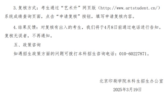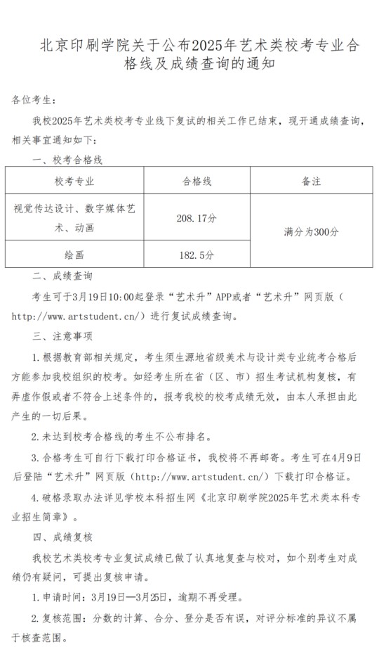 北京印刷學(xué)院關(guān)于公布2025年藝術(shù)類校考專業(yè)合格線及成績查詢的通知