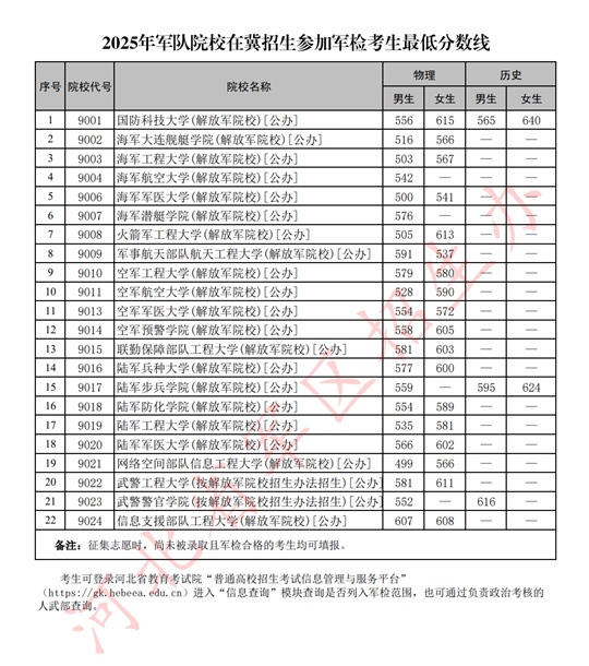 2025年軍隊院校在冀招生參加軍檢考生最低分數線 |