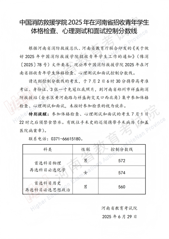 中國消防救援學(xué)院2025年在河南省招收青年學(xué)生體格檢查、心理測試和面試控制分?jǐn)?shù)線