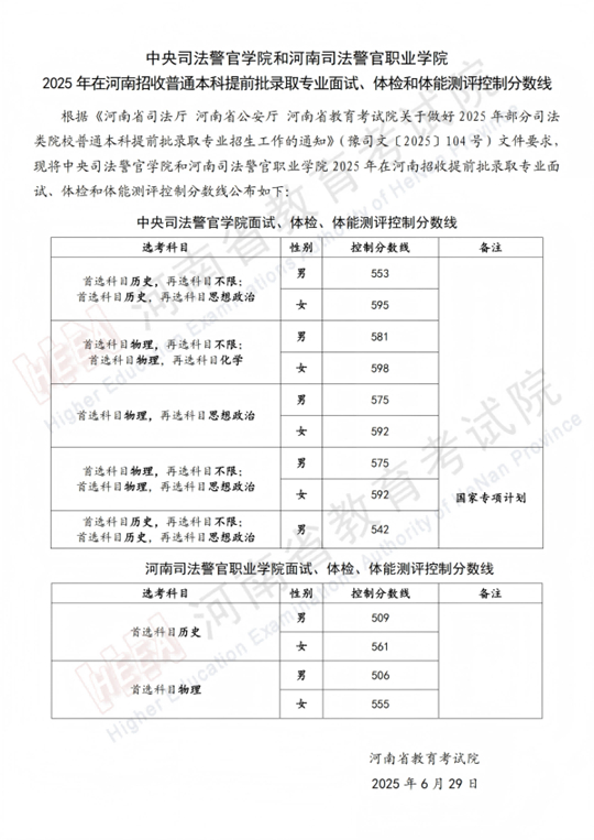 中央司法警官學院和河南司法警官職業學院2025年在河南招收普通本科提前批錄取專業面試、體檢和體能測評控制分數線