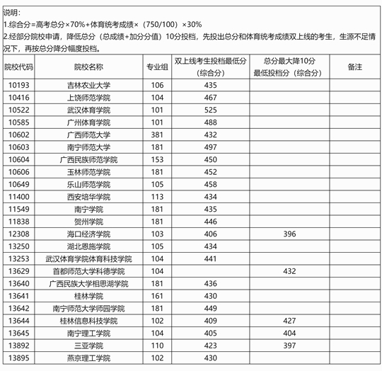廣西:2025年本科提前批體育類院校專業組第一次征集投檔最低分數線(首選物理科目組)