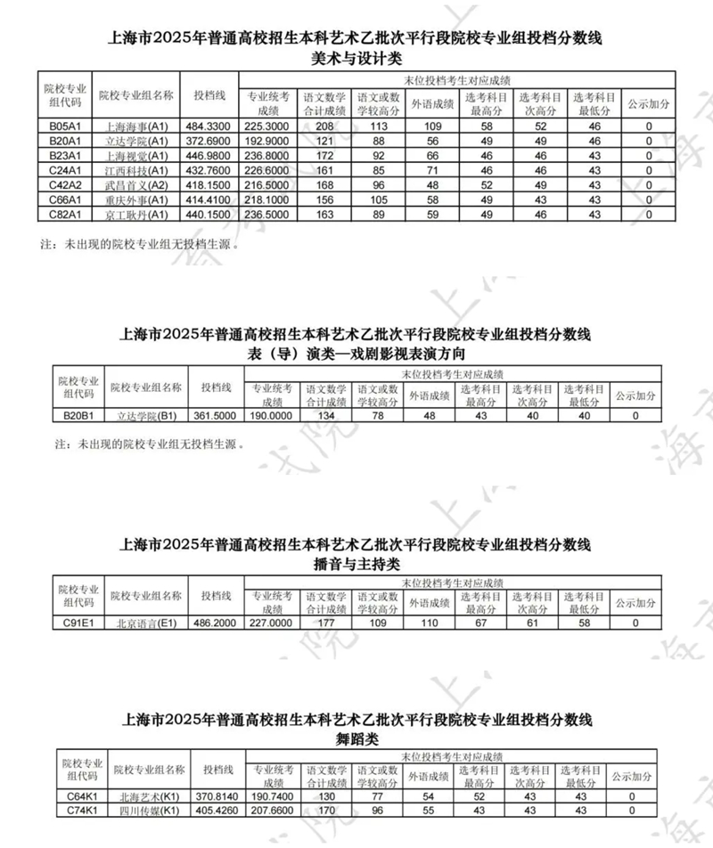 上海市2025年普通高校招生本科藝體類乙批次平行段院校專業組投檔分數線 |