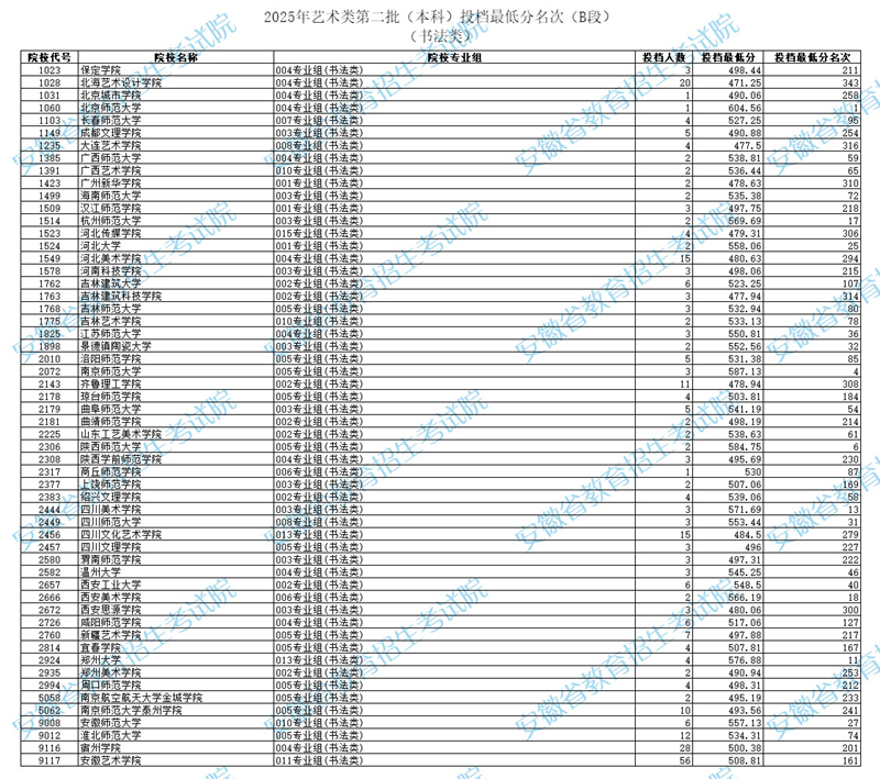 安徽:2025年藝術類第二批(本科)投檔最低分名次(書法類)