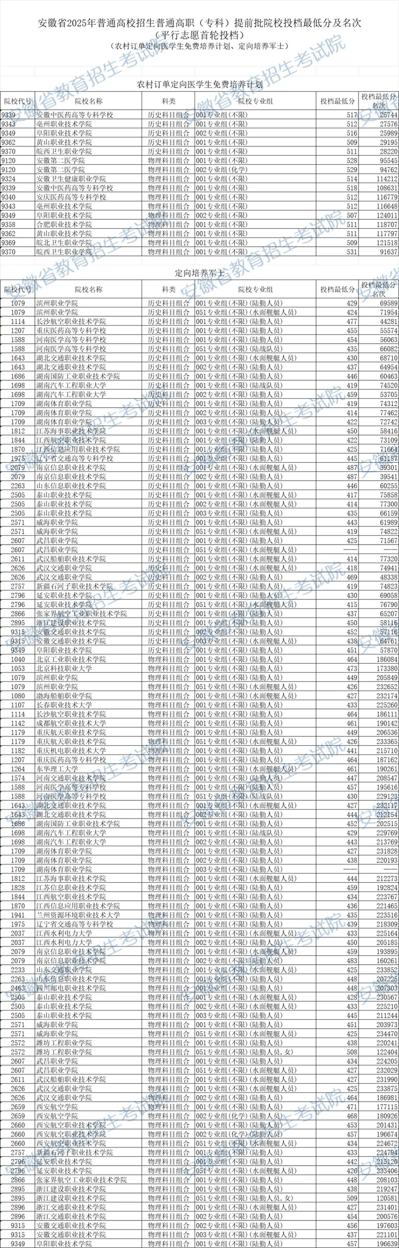 安徽省2025年普通高校招生普通高職(專科)提前批院校投檔最低分及名次