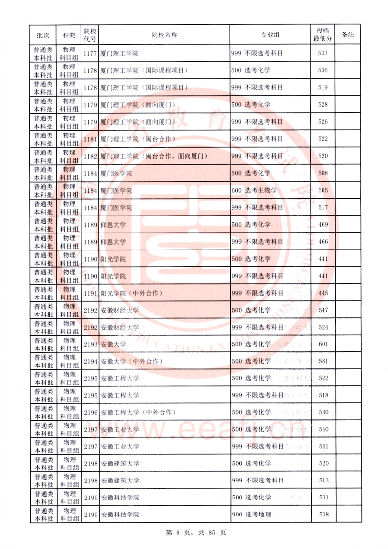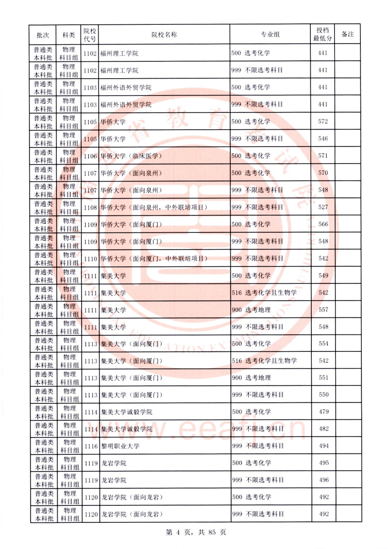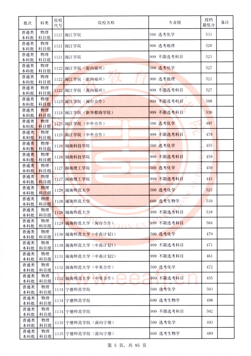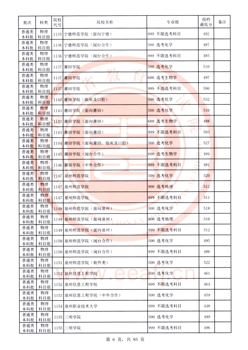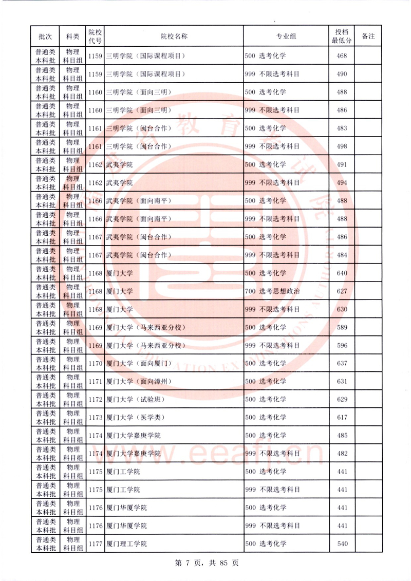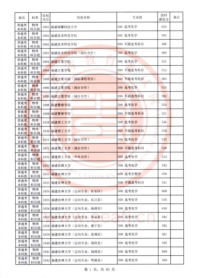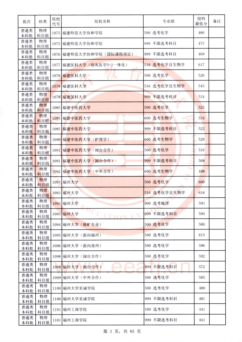 福建:2025年普通類本科批常規志愿院校專業組投檔最低分公布(物理科目組)