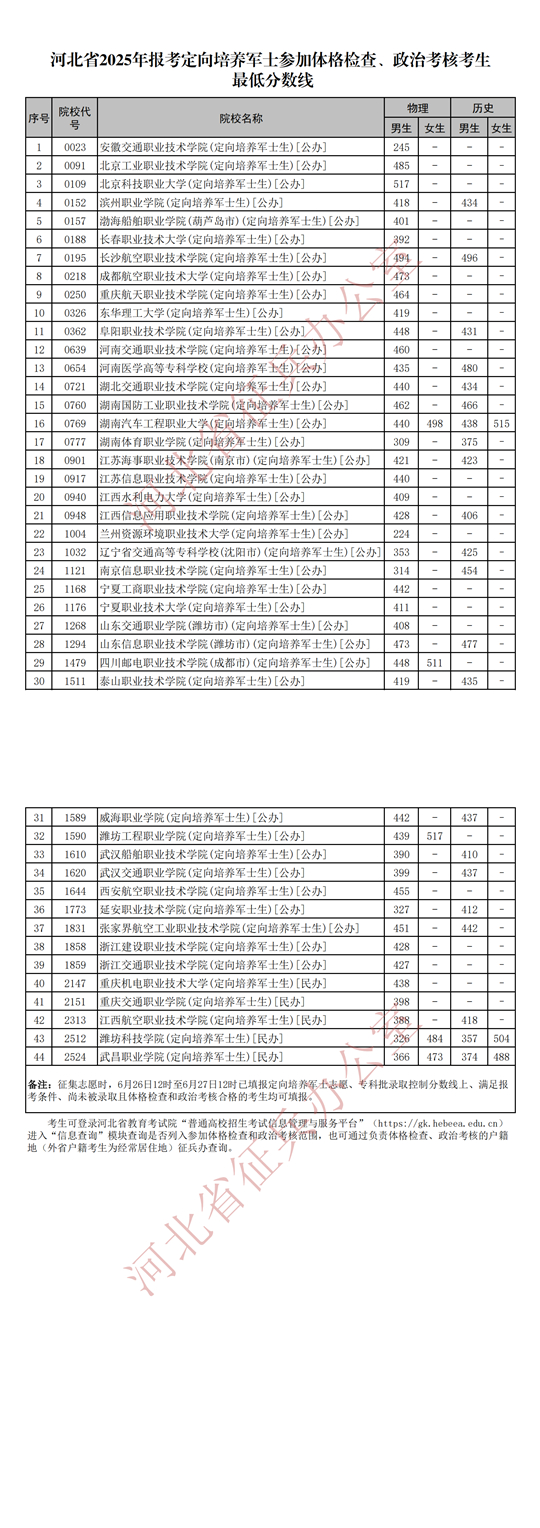 河北省2025年報考定向培養軍士參加體格檢查、政治考核考生最低分數線 |