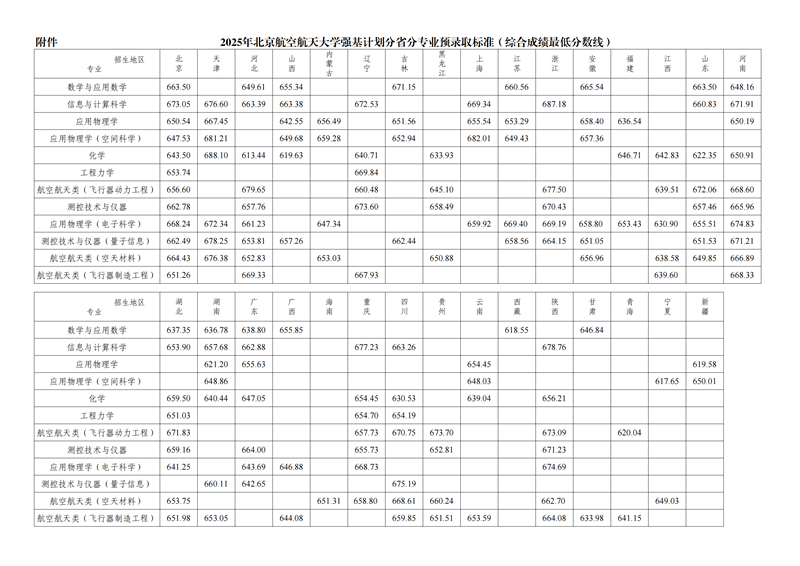 2025年北京航空航天大學強基計劃分省分專業預錄取標準