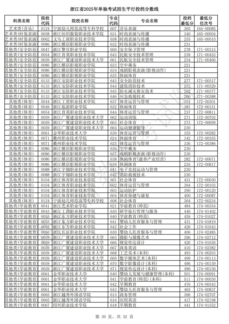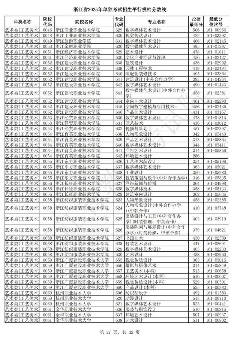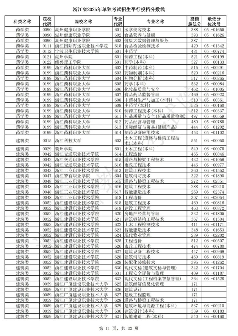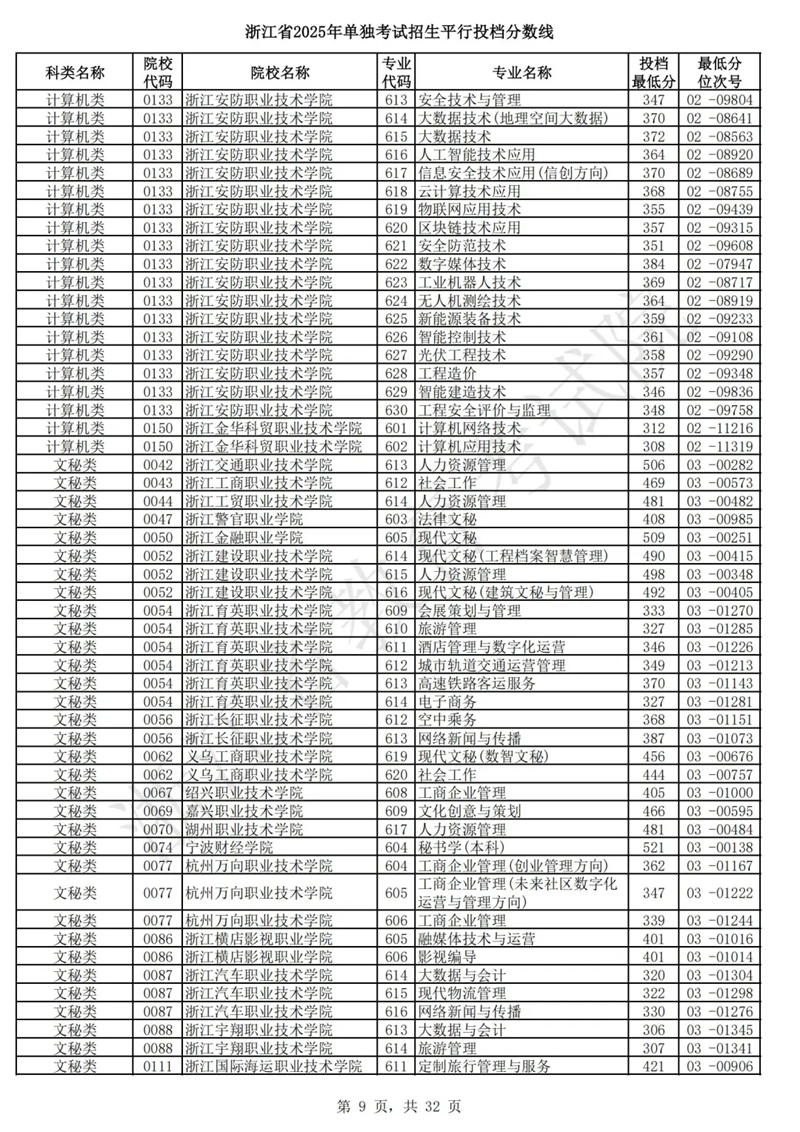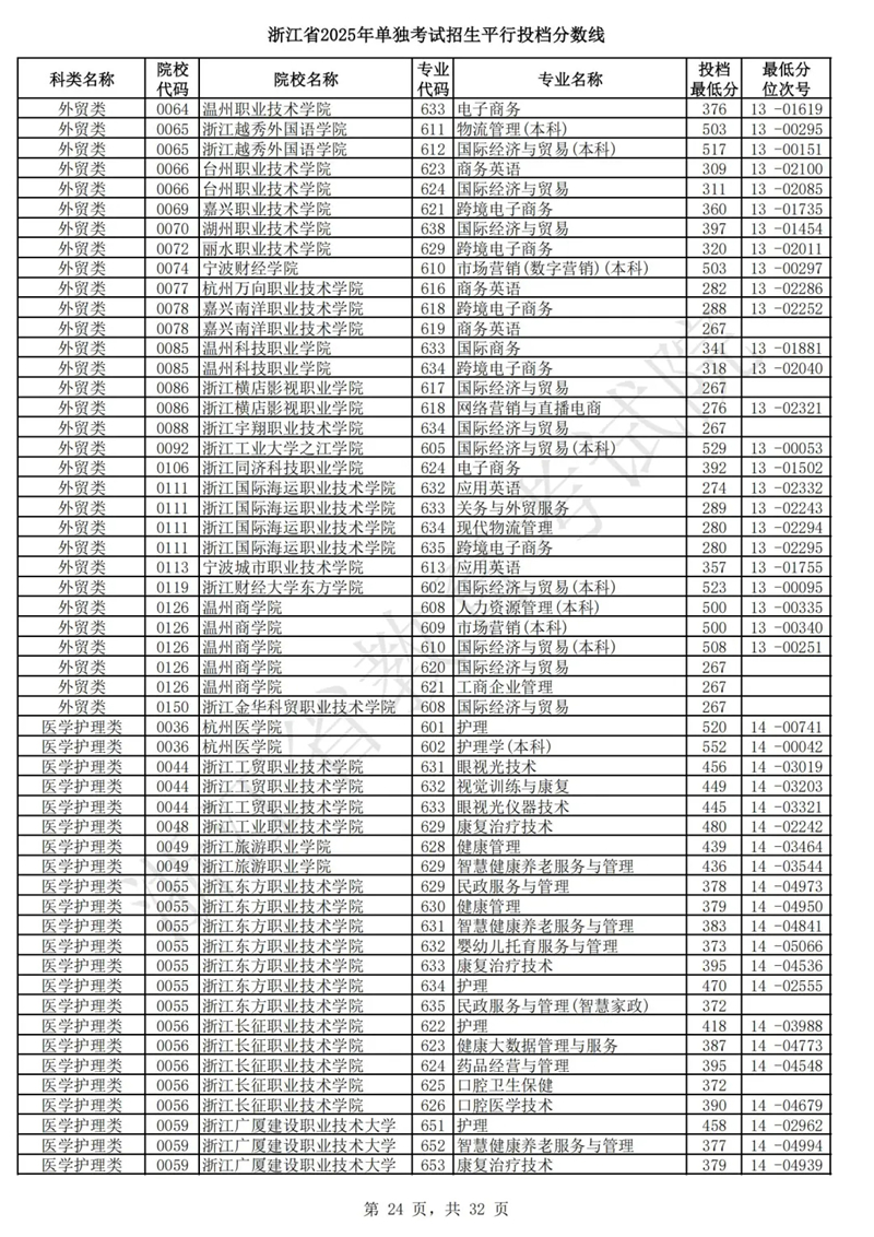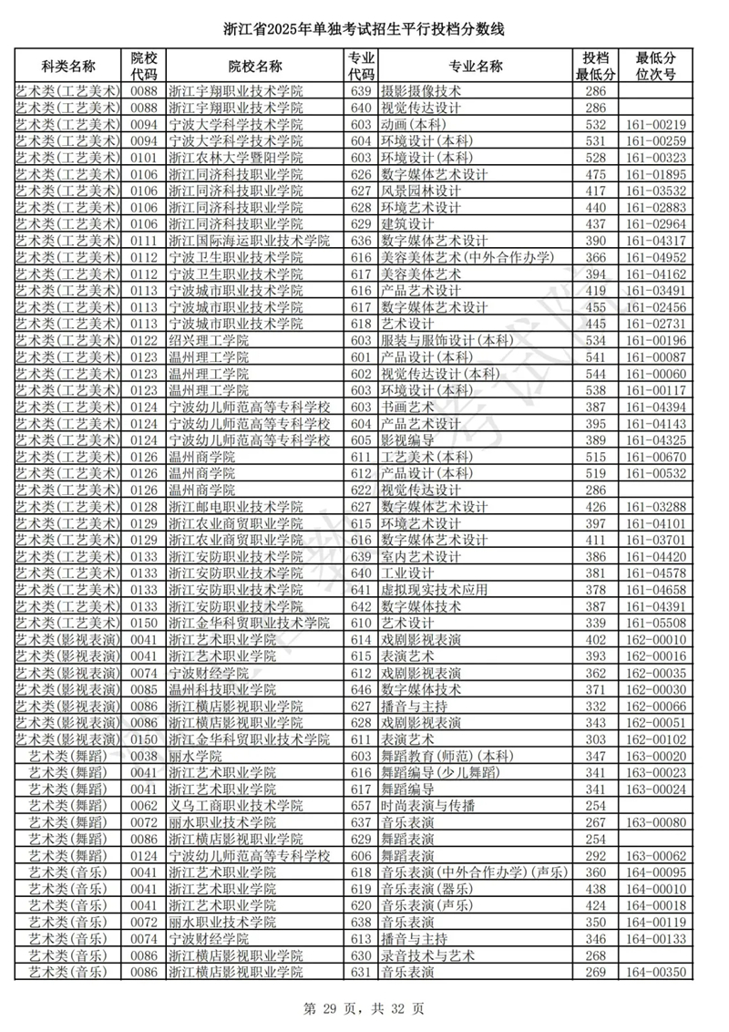 浙江省2025年單獨考試招生平行投檔分數線 |