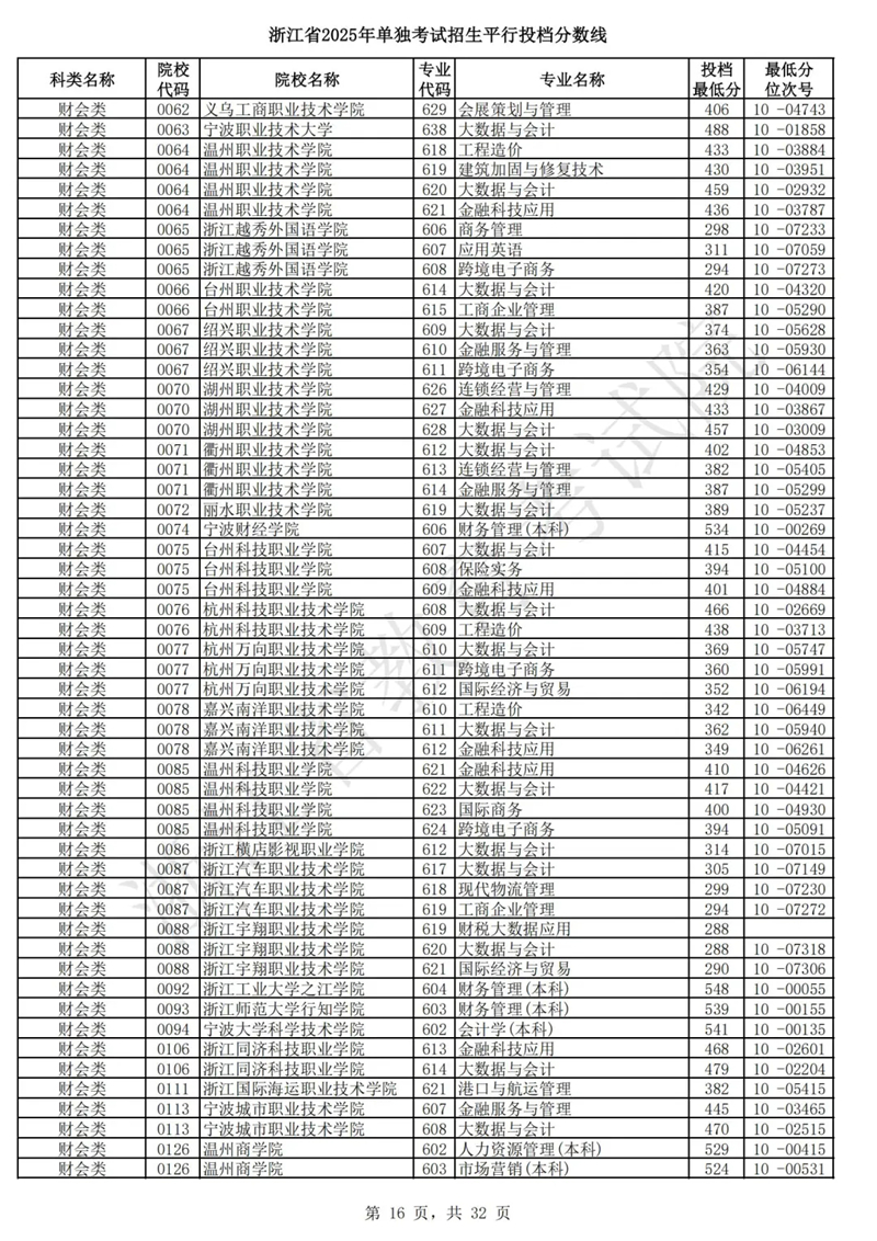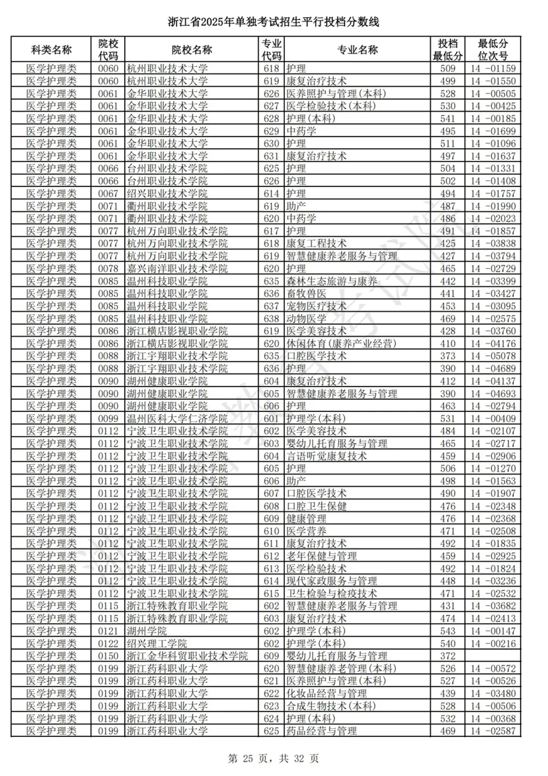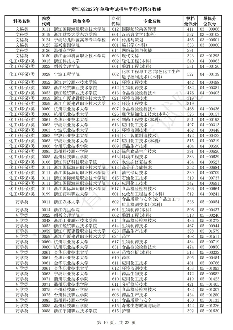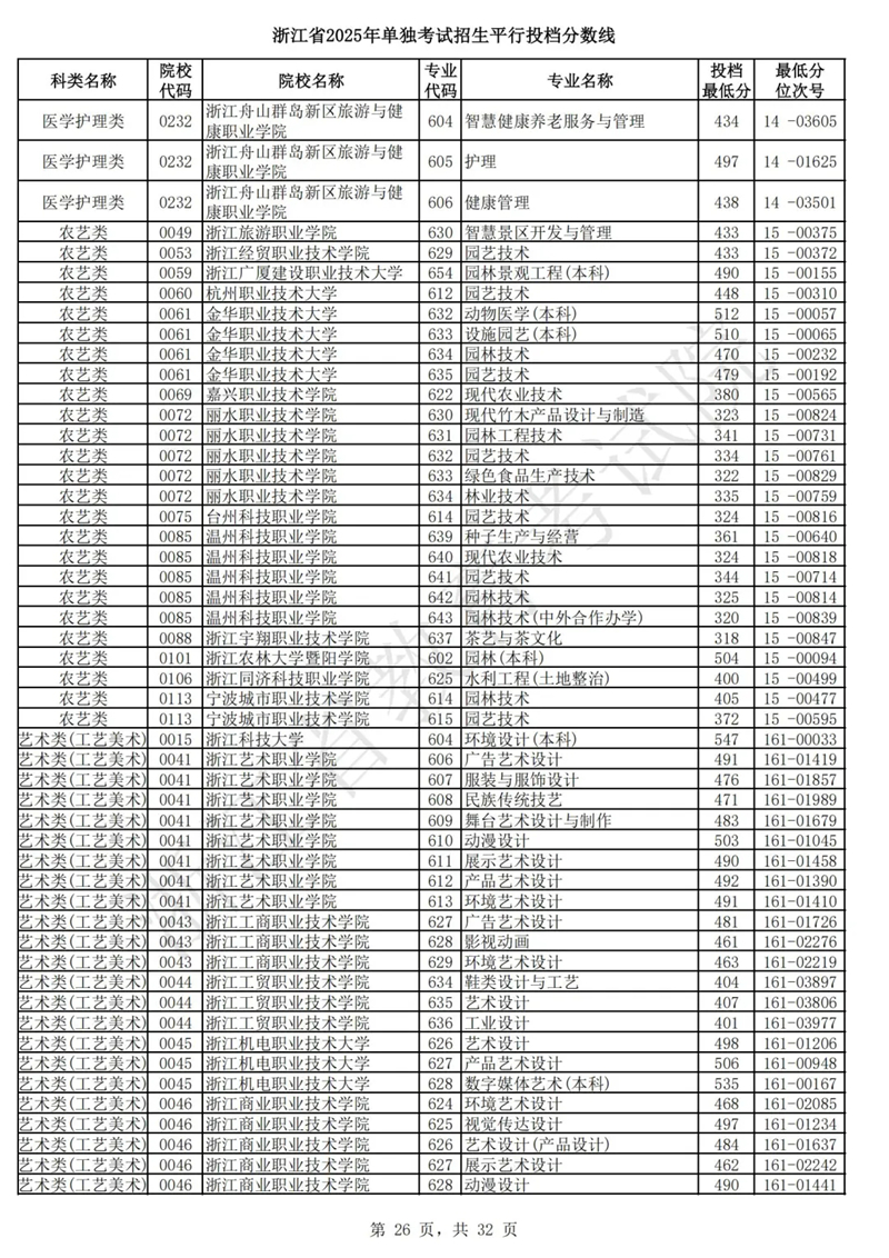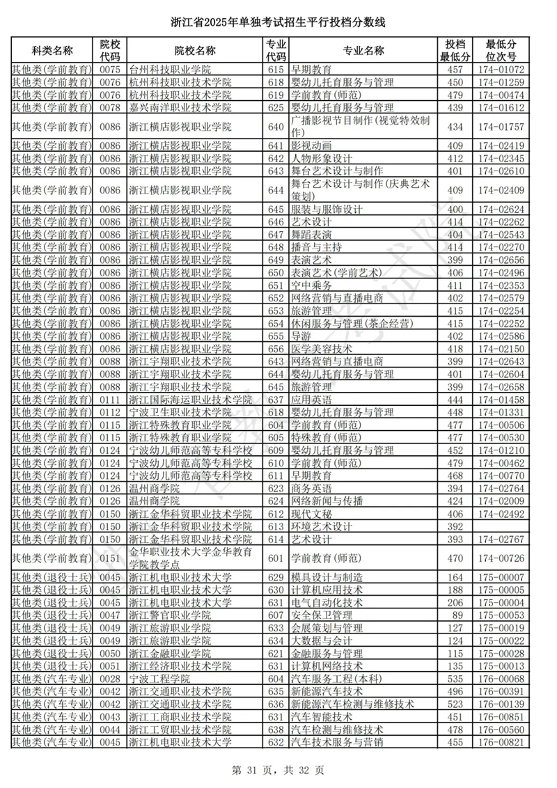 浙江省2025年單獨考試招生平行投檔分數線 |