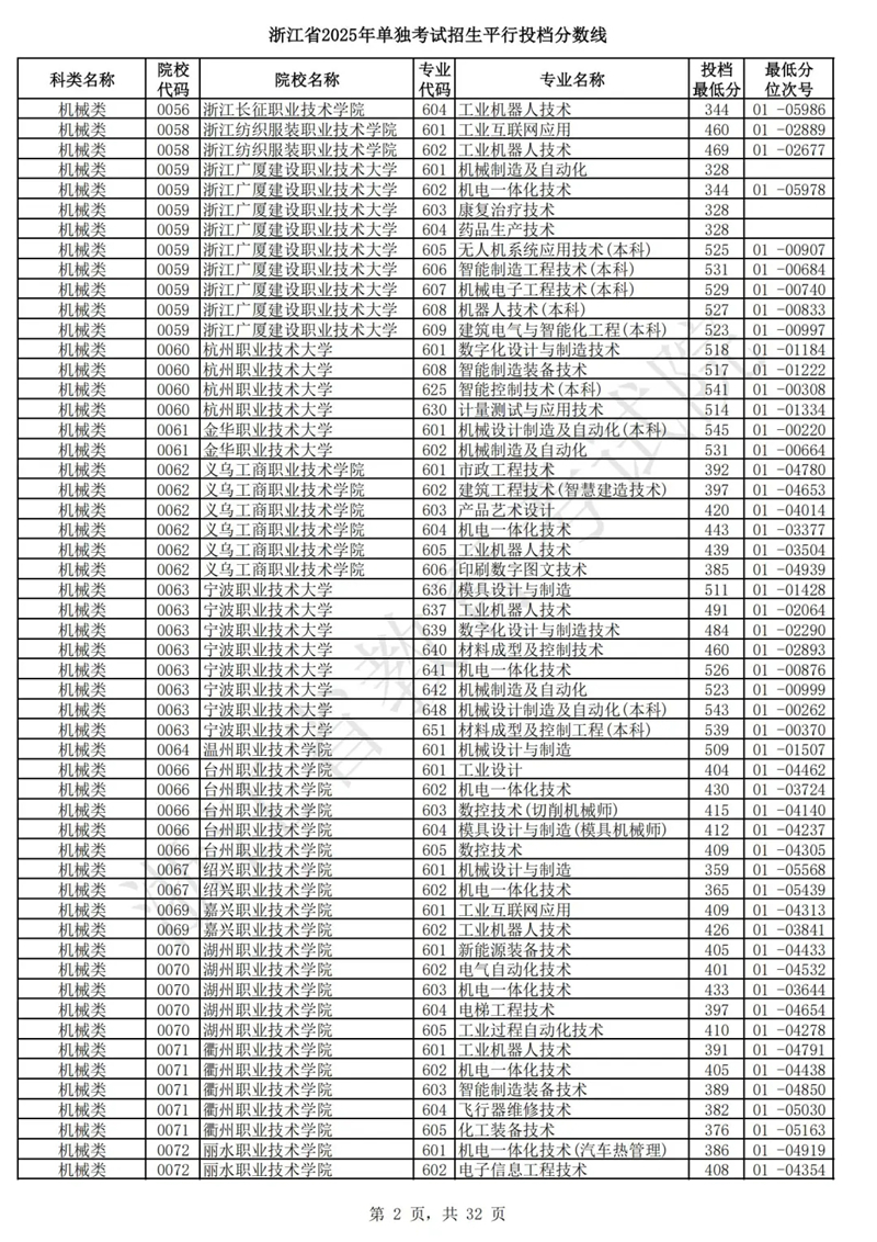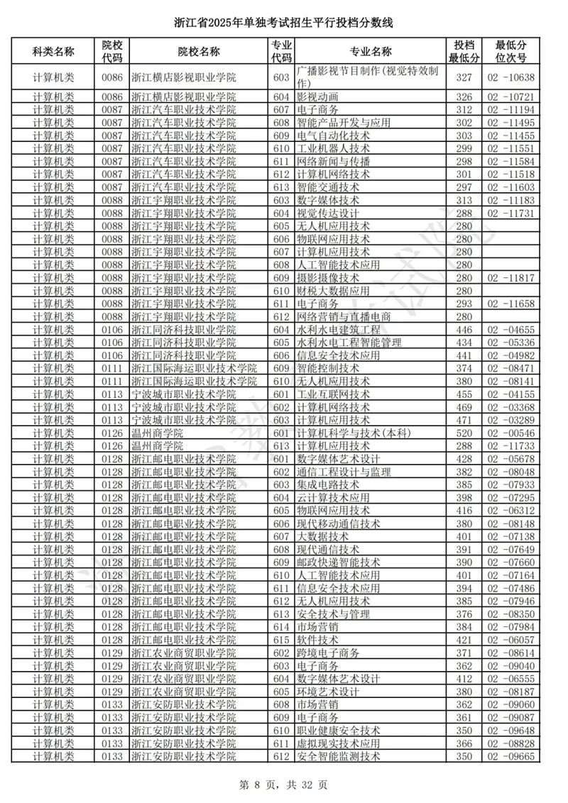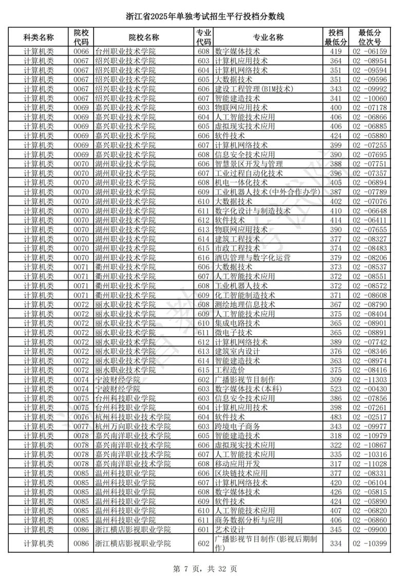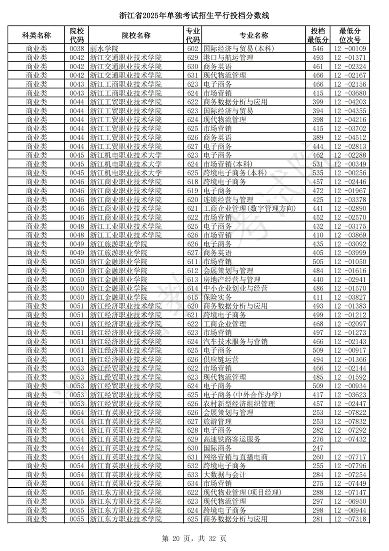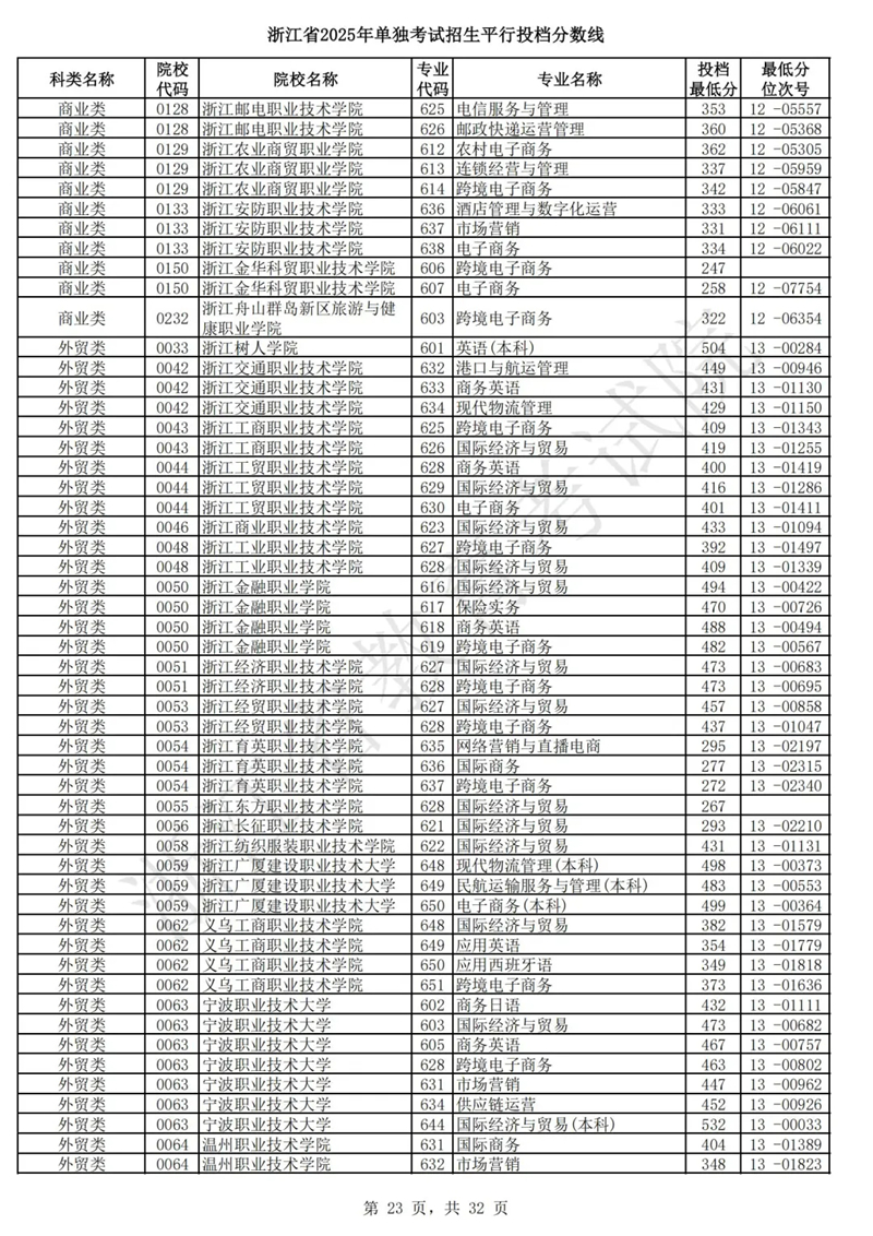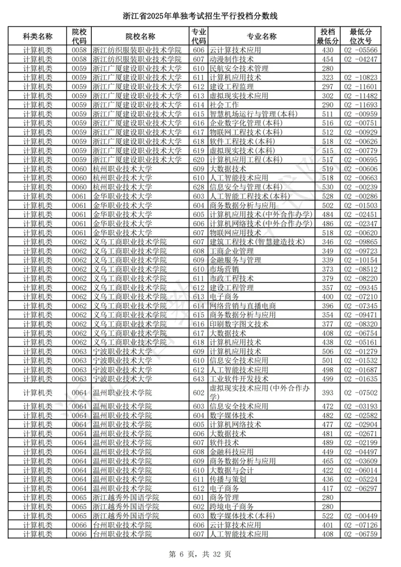浙江省2025年單獨考試招生平行投檔分數線 |