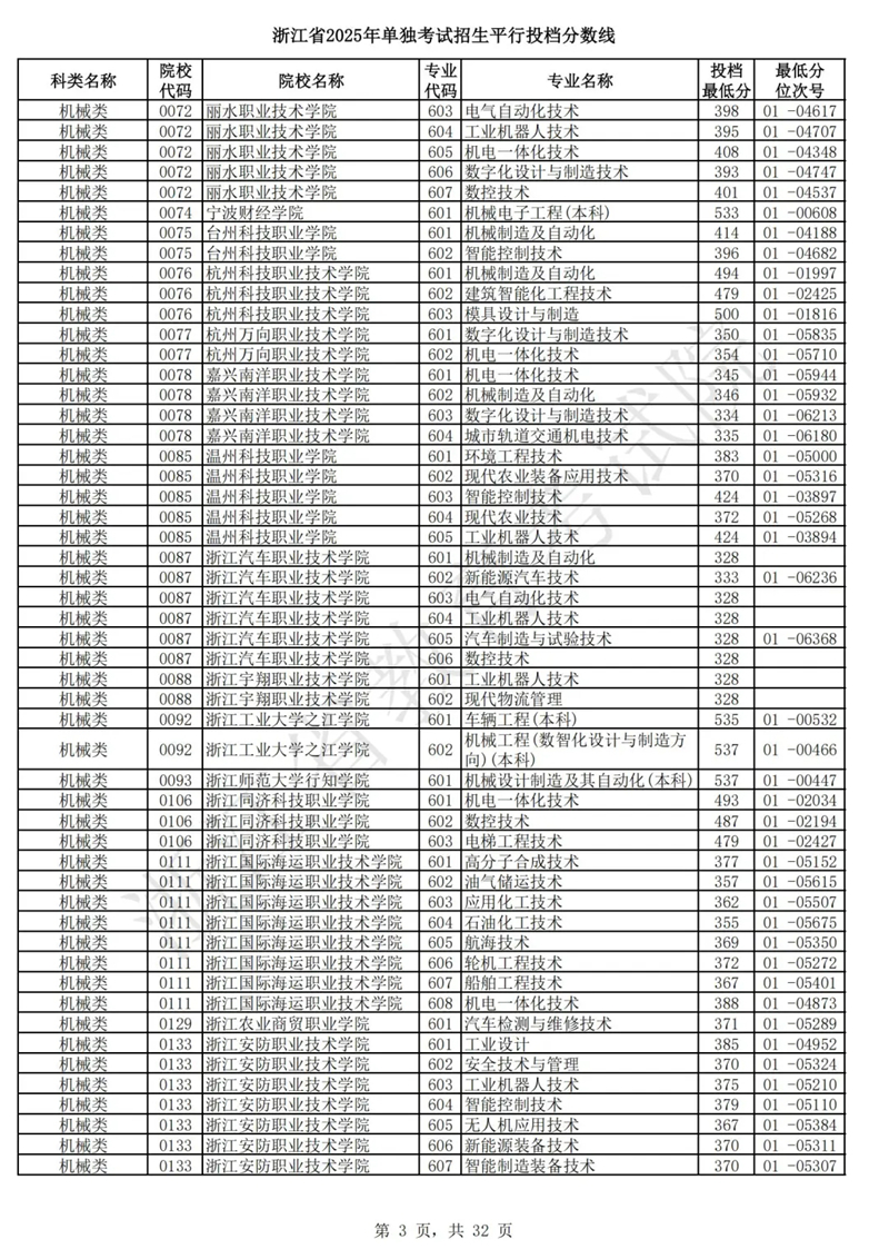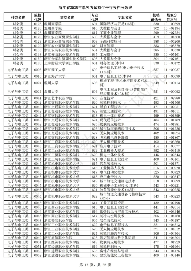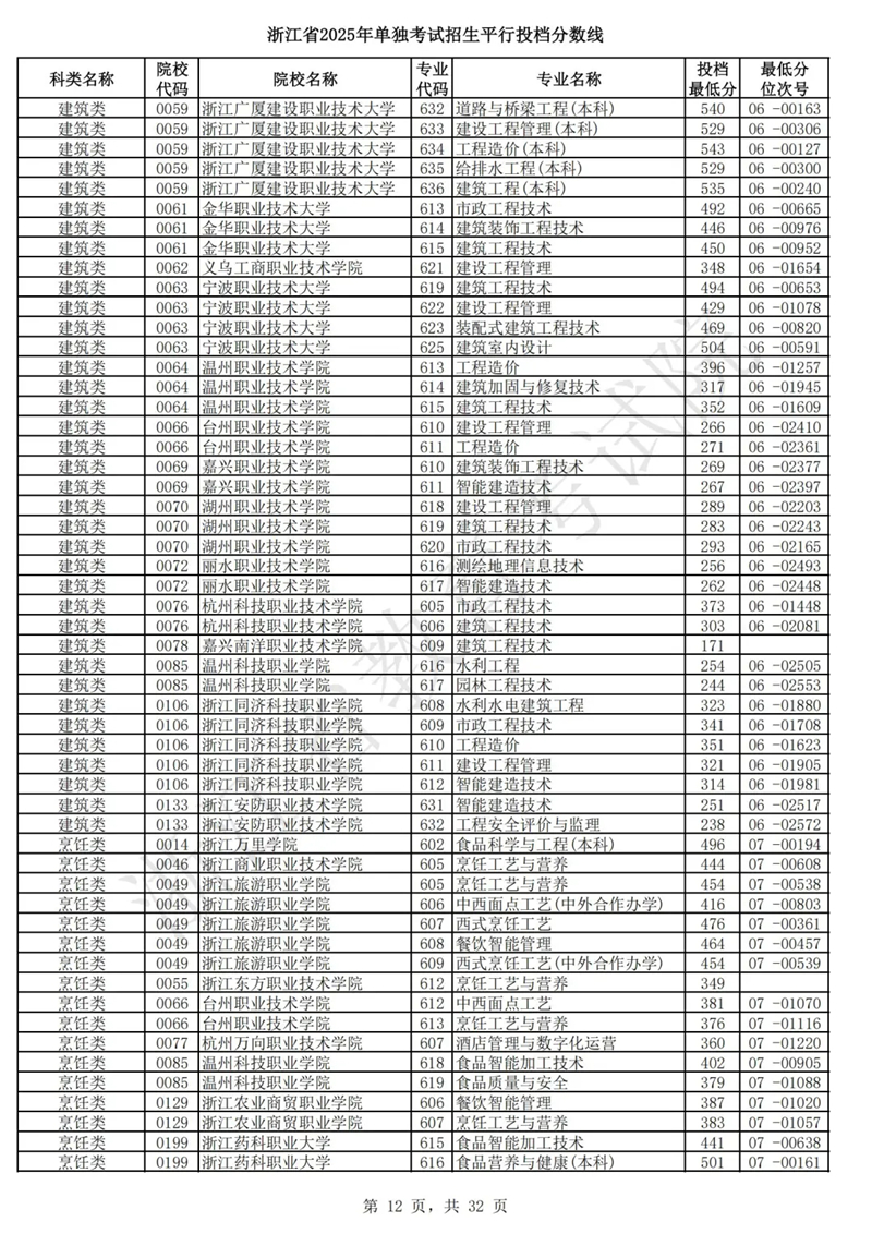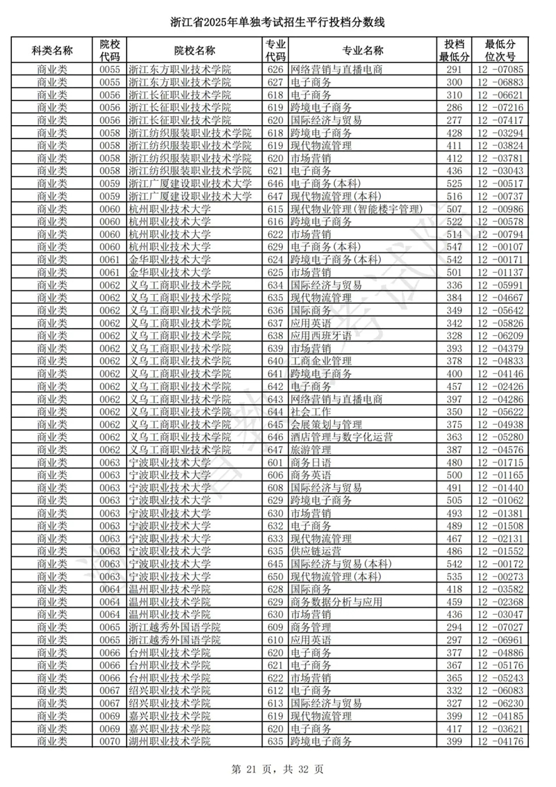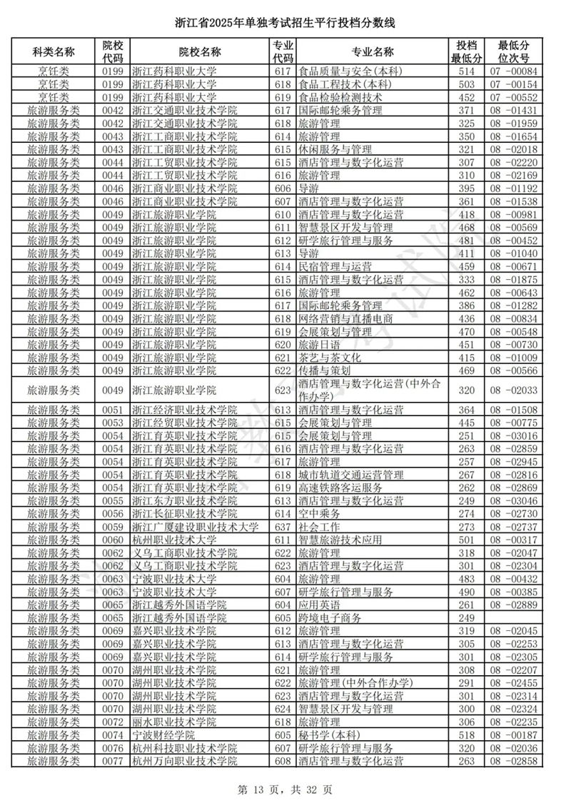浙江省2025年單獨考試招生平行投檔分數線 |