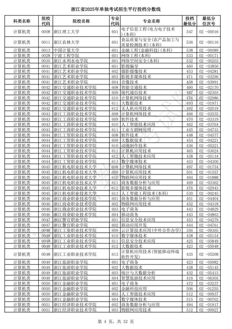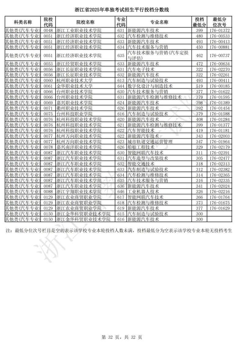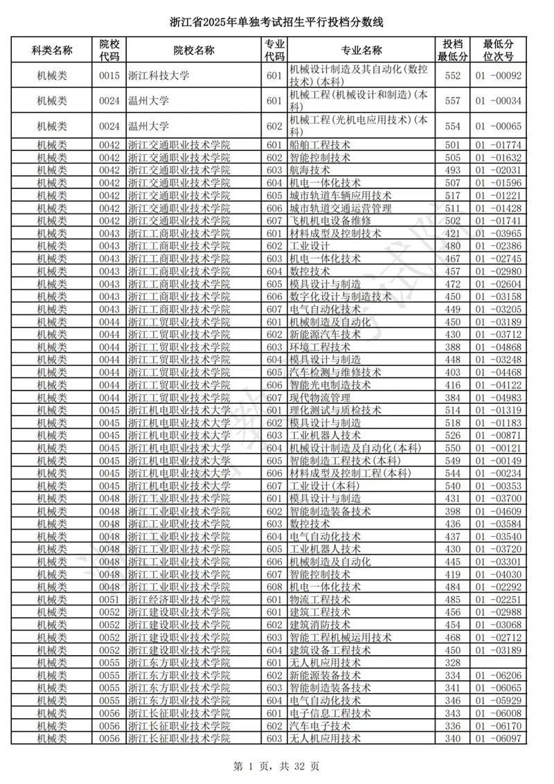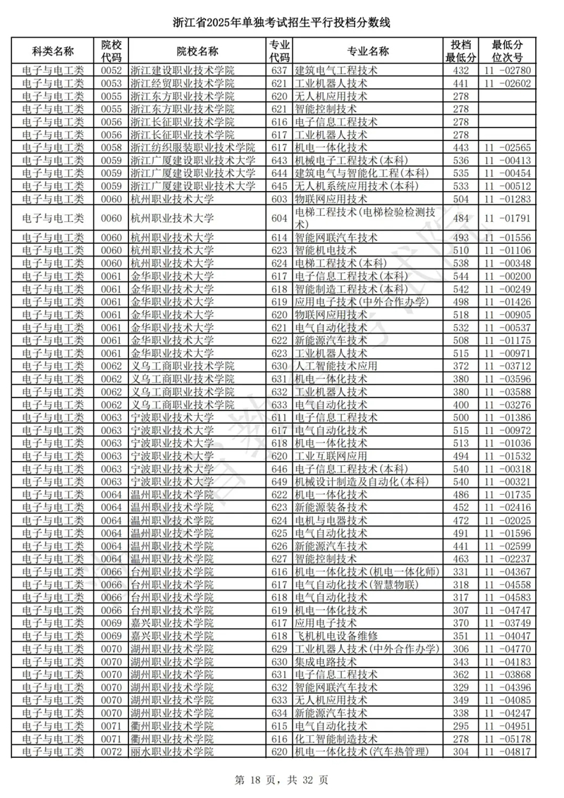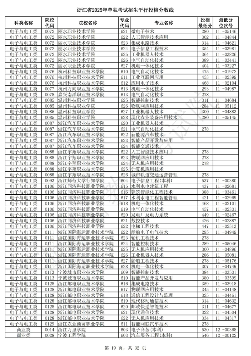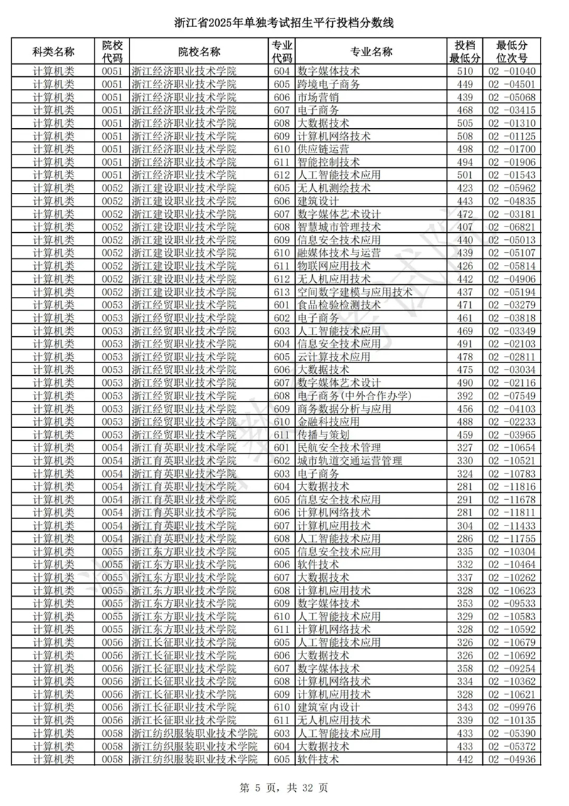 浙江省2025年單獨考試招生平行投檔分數線 |