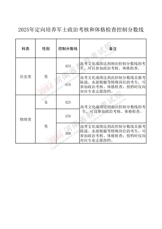 河南省2025年普通高校招生定向培養軍士政治考核和體格檢查控制分數線 |