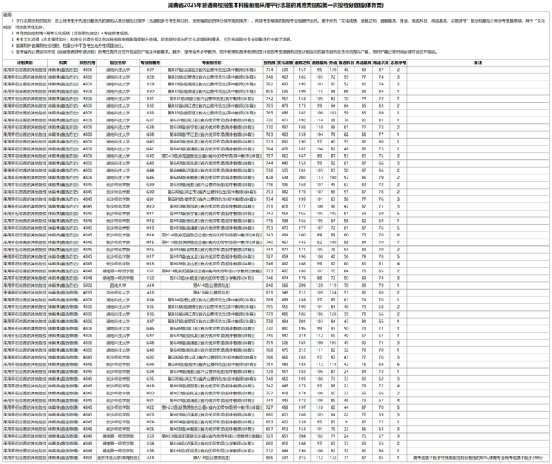 湖南省2025年普通高校招生本科提前批采用平行志愿的其他類院校第一次投檔分數線(體育類)