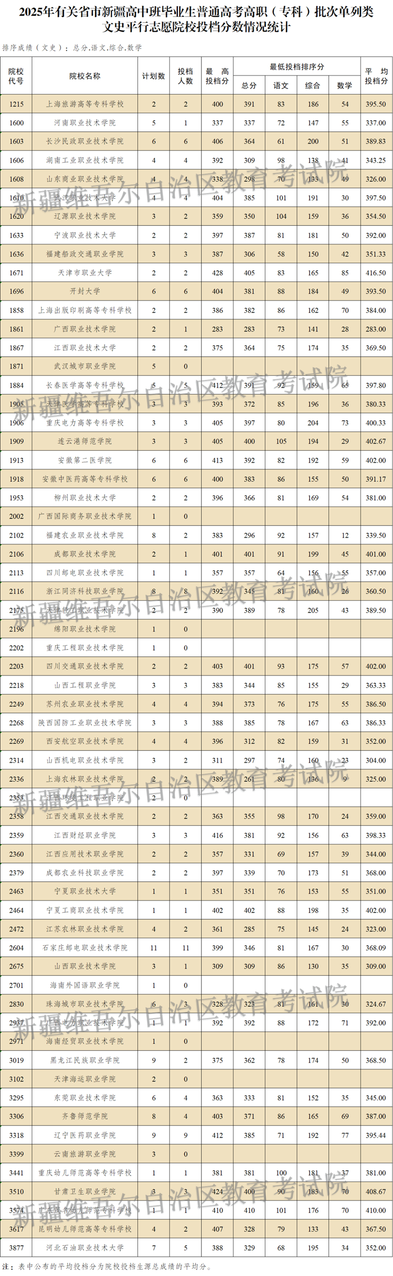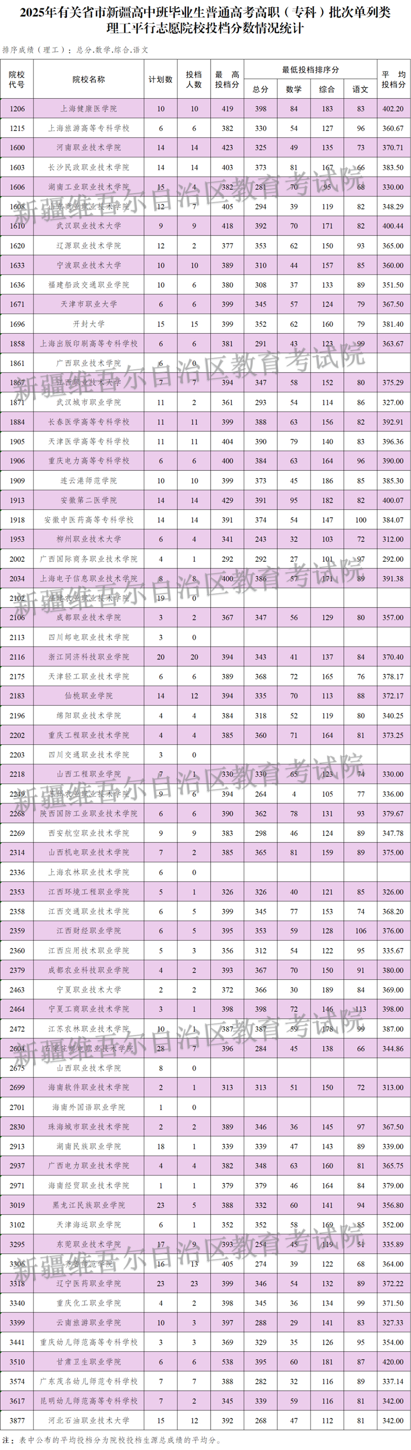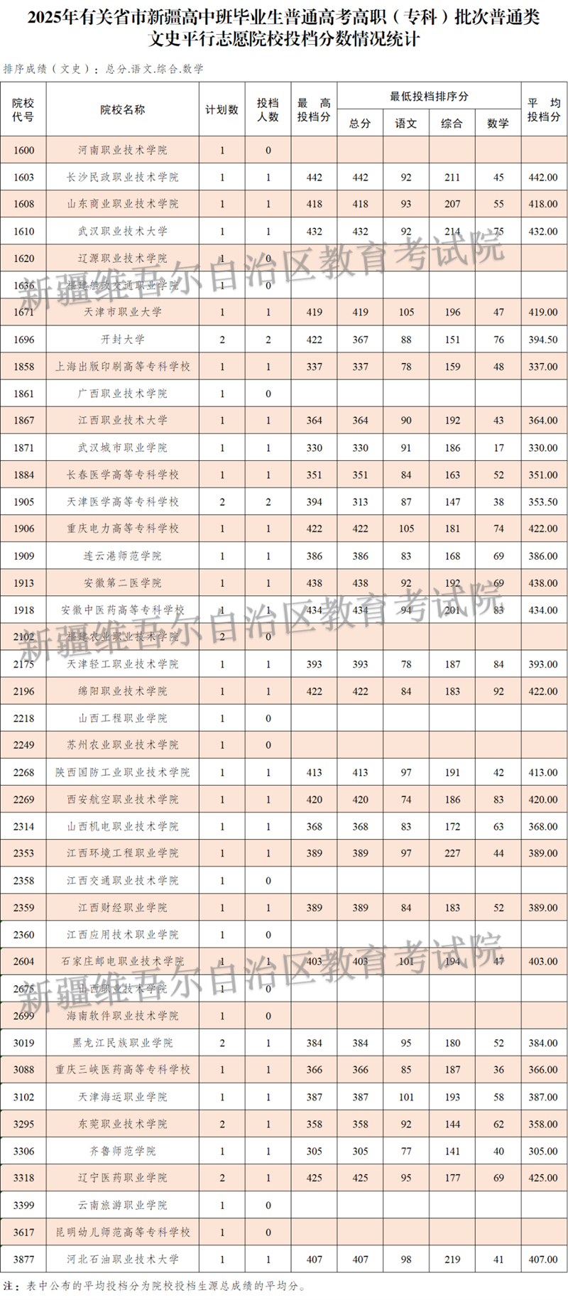 按照錄取工作安排,自治區2025年普通高校招收有關省市新疆高中班畢業生高職(?疲┡斡8月14日正式投檔錄取,新疆教育考試院根據投檔原則進行了投檔,現將相關院校投檔情況公布如下: